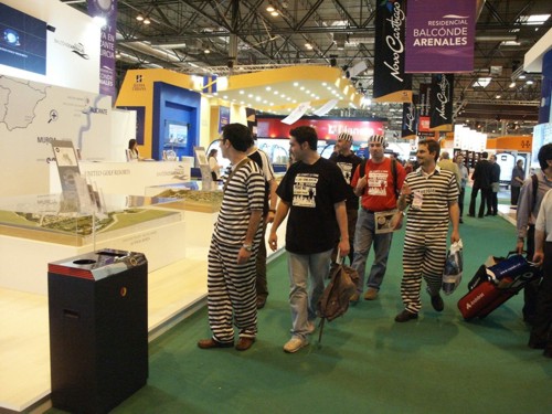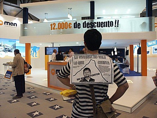 Disfrazados de presos y con billetes de 500 euros (falsos) varios miembros de la Plataforma por una Vivienda Digna hicieron acto de presencia en el SIMA como medida de protesta por la especulación desmedida y la evidente falta de atención que muestra esta feria a los necesitados de vivienda. Como muestra los más de 120.000€ que pedían por pisos situados a más de 50 km de la capital. |