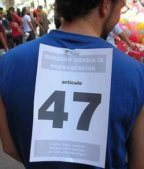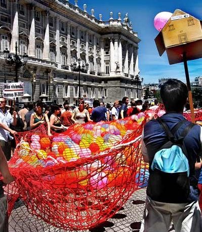 La manifestación estaba convocada a la calurosa hora de las 12:00 de la mañana y tras una jornada de sábado repleta de actos festivos en Madrid. Aún así, tímidamente y poco a poco los manifestantes fueron apareciendo hasta que la marcha tomo cuerpo en unos 3.000 manifestantes encabezados por la pancarta de la asamblea contra la precariedad y por la vivienda digna y una red de globos que representaban la burbuja inmobiliaria. El grupo de samba Zacatum amenizó todo el recorrido con batucadas que invitaron a todos los manifestantes a bailar y a corear consignas tales como "queremos un pisito como el del principito" (vieja conocida de las manifestaciones por el derecho a techo :), "que pasa, que pasa, que no tenemos casa", "detenidos absolución", "basta ya de especulación" y otras. |