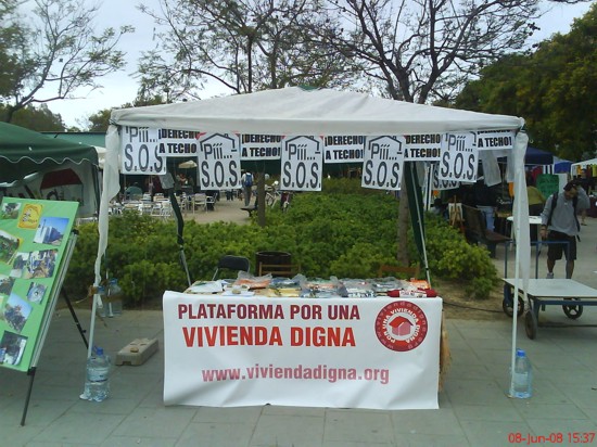 El pasado mes de junio se celebró en la capital del Turia la XXI edición de la Feria Alternativa de Valencia, y la Plataforma por una Vivienda Digna estuvo allí. La singularidad de esta encuentro reside en la naturaleza de sus participantes; colectivos sociales y artesanos que encuentran en este espacio la posibilidad de exponer otras formas de vivir y de pensar. Una vez más, tuvimos la ocasión de compartir nuestras demandas y dar a conocer nuestras propuestas para lograr un desarrollo sostenible que respete y haga efectivo el derecho al acceso a una vivienda digna recogido en nuestra Constitución en su artículo 47. |