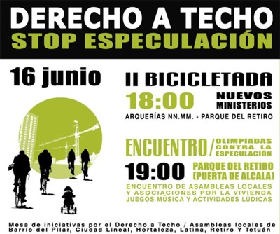 En esta ocasión acudimos a la convocatoria de la Mesa de Iniciativas por el Derecho a Techo y algunas de las asambleas de barrio por una vivienda digna de nueva creación. El formato escogido para la ocasión era una bicicletada más una serie de juegos olímpicos que simbolizaran la gesta olímpica que supone conseguir una vivienda en este país. |