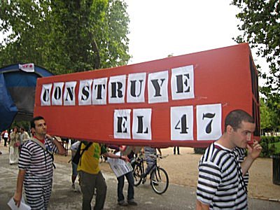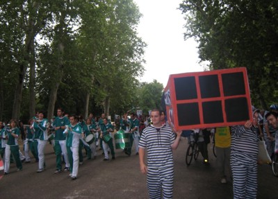 Cuando llegaron al Retiro comenzó la soberbia batucada de Bloco do Baliza que se había ofrecido de manera altruista para la ocasión. En eso se erigió a hombros el ladrillazo, seguido de la tienda de campaña traida desde la acampada en la Complutense y tras estos símbolos, hicimos el paseillo hacia el kiosko seguidos de las bicicletas, la gente de a pie y algunos curiosos que se sumaban al pasacalles. Casi al mismo tiempo que empezaba la batucada comenzó la lluvia, lo que fué una lástima porque vació el Retiro de paseantes y deslució bastante la concentración. |