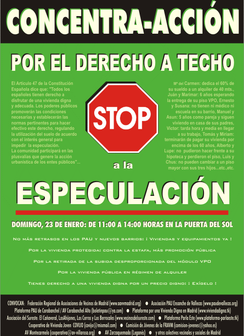 Finalmente el periodista Miguel Ángel Oliver leyó un manifiesto conjunto que giró en torno al artículo 47 de la constitución y dió paso a las declaraciones de los representantes de los diversos colectivos allí reunidos. El representante de la Plataforma por una Vivienda Digna, habló del gran expolio al que se está sometiendo a la juventud española, de las pocas opciones que se están dejando a los jóvenes, arremetío contra los políticos por incumplir sistemáticamente el artículo 47 de la Constitución y habló de que el problema de la vivienda es un problema de todos, no sólo de los excluidos del mercado de la vivienda. La Plataforma también repartió 1.000 octavillas con nuestras reivindicaciones a los viandantes y atendió a los medios de comunicación: Efe, TVE, Localia y El Mundo entre otros. A todos los que colaborasteis pegando carteles, difundiendo la convocatoria en vuestras webs o por los foros y especialmente, a los que acudisteis frío domingo a la Puerta del Sol a reclamar vuestro derecho constitucional a un techo y el fin de la especulación: GRACIAS, este es el camino, nos veremos en la siguiente. Pronto seremos más, muchos más. A los demás, dedicarles palabras aparecieron unos días antes de la concentración en el foro de Getafe.net: "Para estos problemas sociales como son la vivienda, los sueldos, el paro, etc. hace falta una revolución social por parte de los jovenes. En otro tiempo no muy lejano, los jóvenes se unían, salían a la calle a manifestarse a dar la cara. Hoy en día existe un pasotismo por parte de nosotros, los jóvenes, que nos lleva en muchos casos a protestar individualmente, pero a no hacer nada colectivamente. La unión hace el poder. Los ricos se unen en su bien en común y así de bien les va. Piensalo." |