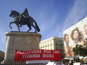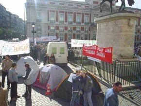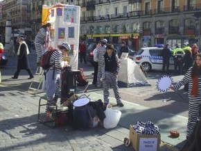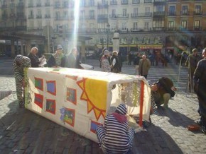 En la Puerta del Sol nos volvimos a juntar miles de personas para protestar contra la especulación inmobiliaria y en favor del "derecho a techo" recogido en el artículo 47 de la constitución española. Las tiendas de campaña se desplegaron debajo de la estatua de Carlos III, aquel que llamaron "el mejor alcalde de Madrid" y que seguro que nunca pudo imaginar que los jóvenes iban a ser expulsados de esta manera tan dramática de la ciudad. En las tiendas figuraban carteles como "280.000€, situadisimo", "Oferta: 100.000€ (tachado), 200.000€ (tachado), 300.000€", "Alquiler: 1.000 €. Imprescindible contrato fijo, nómina de 1.900€, aval bancario, aval paterno y certificado de penales". Los numerosos amigos de COVIJO paseaban por Sol con un traje de preso, mientras arrastraban con sus pies ladrillos atados a una cadena. Algunos miembros de la Plataforma acompañaban con caretas de Gallardón, Aguirre, Trujillo y Florentino. La Plataforma grabó más de 30 entrevistas para el cortometraje "¿qué problema tienes tú con la vivienda?", iniciativa que tuvo una muy buena acogida. También se recogieron decenas de firmas de apoyo a nuestras reivindicaciones. Muchas firmas eran de personas mayores que habían acudido allí para protestar por una situación que consideraban totalmente injusta para sus hijos y nietos. Uno se pregunta donde estaban éstos. Hubo constantes caceroladas y pitadas de las personas que reclamaban la entrega de sus casas, el control del fraude y equipamientos en los PAU. Los amigos de Carabanchel montaron un centro de salud y un colegio que hasta llenaron de aplicados alumnos. También se oyeron muchas consignas contra Madrid 2012. |