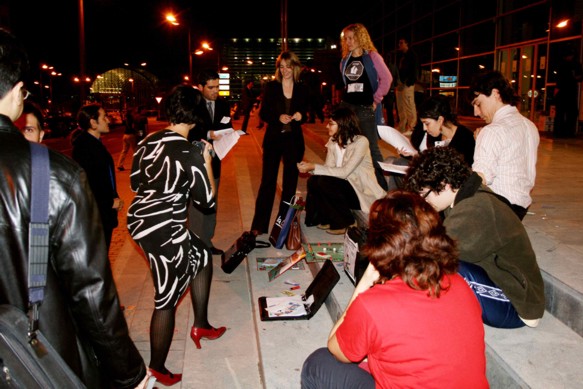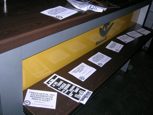 Después de dar las consignas de seguridad y citar una hora para reunirnos de nuevo en la puerta, entramos en parejas y nos distribuimos a lo largo y ancho de la feria (que por cierto, era enorme). Nos asomaba algun que otro billete de 500 € (Bin Ladens) de los bolsillos. Yo iba con el Ladrillopoly en la mano a modo de carpeta e íbamos repartiendo entre los asistentes (sobre todo gente joven y parejas) cuartillas y preguntándoles si buscaban piso y deseándoles suerte (suerte majete!); que la iban a necesitar. Los 50 minutos que nos habíamos dado para recorrer la feria se pasaron volando, de hecho alargamos un cuarto de hora más por lo bien que se lo estaban pasando los asistentes. Vimos incluso a gente que a motu propio se había llevado fotocopias para repartir (vamos que no se si están en la plataforma o qué pero desde luego no habían acudido al punto de reunión)...Lo divertido era ver cómo nos miraban los apostados en los stands mientras repartíamos y preguntábamos en las colas de gente que esperaba su pisito ideal en alguna promoción. |