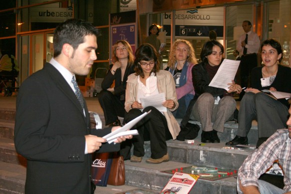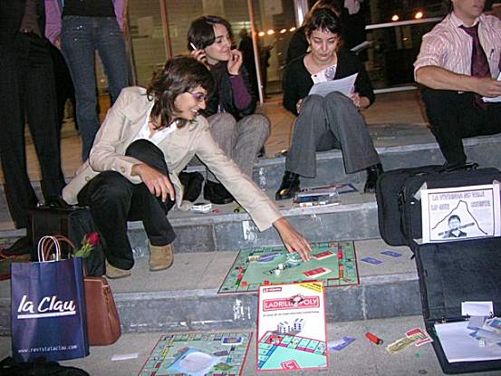 A eso de las 18:15 nos volvimos a reunir en la puerta de la feria, donde ya habían algunos jugando al monopoly sentados en las escaleras. Sacamos igualmente el ladrillopoly y la gente se puso a jugar, alguno vociferaba por el derecho a la vivienda...en ese momento veiamos movimiento de policía nacional. Nuestra fotógrafa tiraba cuartillas por el suelo delante de sus narices, con una impunidad pasmosa (!!!)...sacamos el comunicado, una compañera enchufó la cámara de vídeo, y con los compañeros sentados en las escaleras de entrada a la feria leímos en alta voz el comunicado que había sido escrito esa misma mañana, denunciando la pasividad de los gobiernos, sobre todo municipales en las políticas de vivienda, en la cultura del interés especulativo y de dinero rápido que se había creado y en la desprotección y desoimiento al ciudadano de a pie...luego leímos las reivindicaciones principales del manifiesto de la Plataforma. Durante esos minutos llegaron un par de coches de la policía local e incluso un responsable de la feria salió a la puerta indignado y pidiendo a los nacionales que hicieran algo. Alcancé a ver cómo uno de ellos nos contaba con la mano y le negaba al sujeto de la feria como diciendo: -"son dieciséis, nada que hacer"-, qué sensación de poder te entra cuando puedes hacer cosas con esa impunidad. Notábamos la incomodidad de los responsables de la feria y el tener a 15 policías repartidos cerca de nosotros sin poder hacer nada te hacía sentir como dios. |