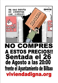 | Poco a poco fue llegando la gente y hacia las 20:00 comenzamos a sentarnos, con unas cuantas pancartas de mano que teníamos preparadas con lemas como "Vivienda Digna ya!" o "Bilbao, 80.000 viviendas vacías" o "La vivienda es un derecho, no un negocio". Además, dimos la posibilidad a los asistentes de escribir sus propios lemas en pequeñas pancartas que colgaban del cuello, y así escribieron poemas cortos como "más eyacular y menos especular", "no quiero vivir en las nubes" o "no hipoteques tu vida". La pancarta oficial llevaba el lema "no compres a estos precios" con la web y el logo de la Plataforma. |