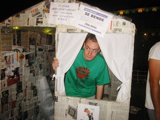 También montamos nuestra casa-piloto, que nos acompañó también los días anteriores en el recinto festivo, toda una obra de ingeniería de madera y cartón... 4 metros cuadrados, céntrica, vistas a la Ría, ¡todo un chollo! Al principio la vendíamos por 30.000 euros pero luego vino una inmobiliaria y nos dijo que le podíamos sacar 360.000 perfectamente. Un metro cuadrado pintado en el suelo al precio de 6000 euros, junto a unos ladrillos y unos rollos de papel higiénico completaban el panorama... una composición digna del mejor museo de arte contemporáneo, para dejar claro que el tema del ladrillo está para cagarse. |