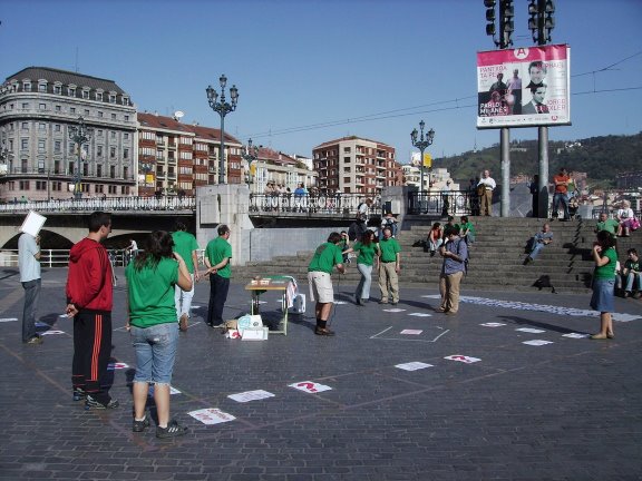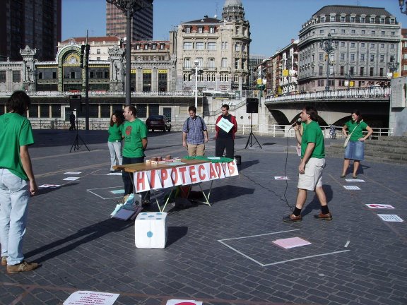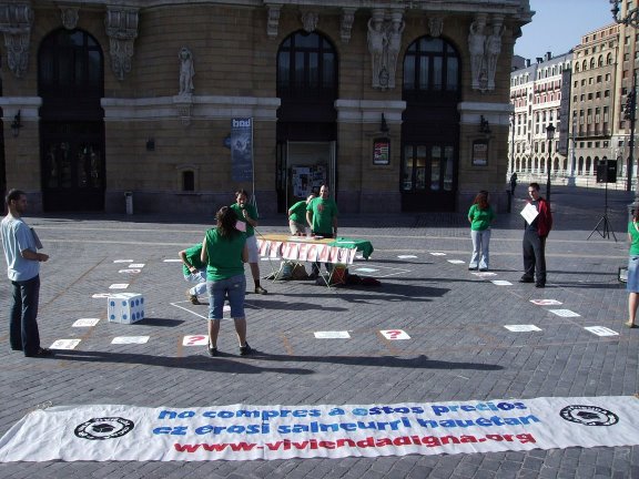 El pasado 28 de Octubre, la Plataforma por una Vivienda Digna de Euskadi, nos dispusimos a jugar al Vivipoly en la Plaza del Arriaga. El Monopoly adaptado a la problematica juvenil de acceso a una vivienda, fue un rotundo exito!!. Tal vez no de asistencia de peña al acto en si, pero si meditatico y de participación de aquell@s que esa mañana nos reunimos alrededor del Arriaga a reinvidicar una Vivienda Digna para tod@s aquell@s que lo necesitemos... Que esto de la falta de techo, no es un juego precisamente!! |