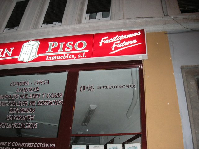 Ya lo veis, 0% DE ESPECULACIÓN, ¿cómo andaran las cosas para que una inmobiliaria tenga que poner eso en su escaparate?, suponemos que igual de bien que a los de Marina de Horror, esos comerciales que tienen ya no dejan escapar ni a la pobre pareja de jovencitos que simplemente quiere ir al Carrefour a por leche, pero vamos a ver, ¿ustedes creen que van a vender un apartamento a aquellas personas que tienen que buscar la leche más barata para llegar a fin de mes?. Y no hablemos de Tecnoguasa, sus corbatas verdes ya se ven más a menudo en la calle que a los mismísimos mormones, creemos que efectivamente, están creando una secta ladrillista que rivalizará con ellos.