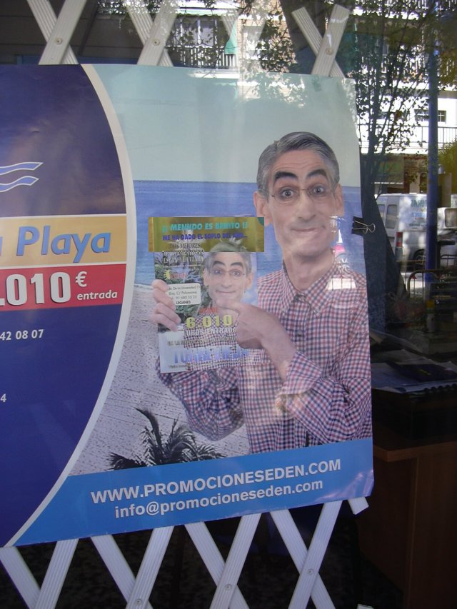 Por cierto, al final encontramos a Benito, en Leganés una inmobiliaria de promociones Eden nos desvelaba el nombre del misterioso personaje que tan poco dinero debe tener después de invertir en apartamentos, porque como veis siempre lleva la misma camisa. Pues eso, menudo es Benito, la muestra del españolismo rancio ladrillero que atiborra la antaño preciosa costa del Mediterraneo para cada día ir destruyendo más y más lo que hizo de España un destino envidiado, ahora precisamente que resurgen Croacia, Macedonia u otros paises de la zona como destinos turísticos tras los lamentables años vividos, curiosamente el lema de Croacia es "el Mediterraneo como siempre ha sido", creo que esa va por nosotros.