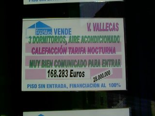 Los precios euro/m2 son insufribles, al nivel de Chamberí en el año 2000, en algunos casos hay estudios de 25 m2 por 96.000 , o sea, 3.800 / m2 por un zulo en un barrio obrero donde el salario medio merodea los 800 al mes. ¿Alguien en su sano juicio cree que una pareja que ingresa unos 1.500 netos al mes puede meterse a vivir en un piso que les cuesta 10 años de salario íntegro?, ese es el caso del cartel que tenemos a la izquierda, 60 m2 a 27.500.000 pts.