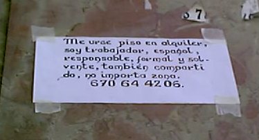 Este cartel me ha dolido en el alma, vean el estado de desesperación de un soltero trabajador, que ha tenido que poner carteles a la "desesperada" por no encontrar alquileres decentes en el barrio. De momento he contabilizado 14 viviendas en venta, seguimos casi con la relación de 1 piso / 100 metros.