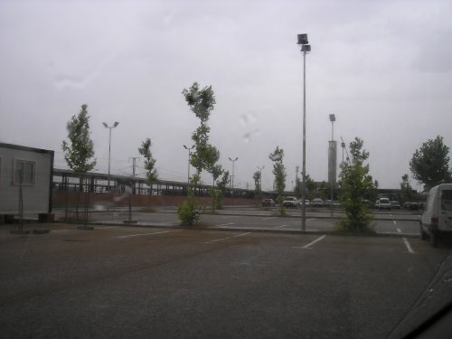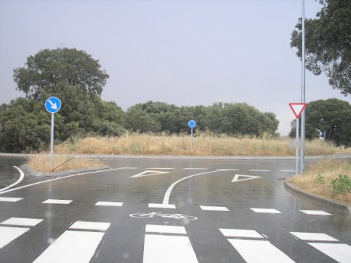 Cerca de la estación se encuentra esa extraña glorieta repleta de encinas, el hombre aparcó cerca de este lugar, a 600 metros de la estación, la próxima vez lo mismo utiliza la bicicleta pese a la lluvia. Nuestro buen amigo ha subido al AVE algo remojado en la parte baja de los pantalones, congelado ha subido al tren y como es un abono (no sabemos si existen en esta línea) resulta que no quedan asientos y tiene que fastidiarse en una banqueta junto a la puerta, con la espalda dolorida del palizón que se dio ayer en una jornada de cerca de 12 horas, apenas si pudo llegar y comer algo antes de irse a dormir.