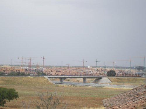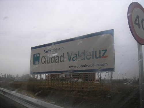La primera impresión al llegar desde la carretera es la de sorpresa, estamos camino de Sacedón, un recorrido que millares de personas hacen cada fin de semana para pasar unas horas de descanso en sus viejos y desploblados pueblos de Guadalajara, nadie se imagina que a 10 Km de Guadalajara va a encontrar un mar de gruas levantando con prisa decenas de bloques, en teoría 8.000 viviendas para 34.000 habitantes. Eso es Valdeluz.