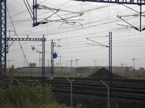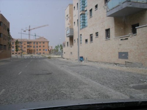 Tuvimos la feliz idea de darnos una vuelta e ir a la estación del AVE, de nuevo recorrimos un desértico paraje, propio de una película de terror nuclear, cruzados y ya en la estación del AVE pudimos fotografiar las viviendas más cercanas, imaginen, una persona de las 34.000 que habitará el PAU (teóricamente) sale de esa vivienda con su coche, pero la estación del AVE tan sólo tiene 150 plazas de aparcamiento, y en el primer tren de la mañana ya subieron 200 habitantes rumbo a Madrid, dejando lleno el aparcamiento, este hombre no tiene más remedio que dejar el coche a una buena tacada de la estación, tras estresarse buscando sitio y malhumorado por los cerca de 15 minutos invertidos en llegar y aparcar, llega jadeando y justito para coger el tren, si lo pierde no podrá coger otro hasta dentro de una hora...