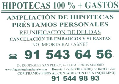 Vaya, 100% + GASTOS, parece mentira, por la mañana veo a un pobre embargado, y ahora resulta que nos traen la solución a nuestra calle, ¡cómo no nos habíamos dado cuenta!, los muy majetes te cancelan el embargo y el constructor ese sin saberlo :P