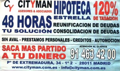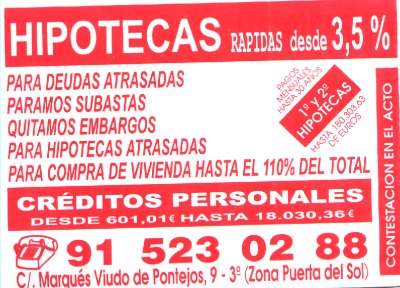 Bueno, llegado al trabajo desconecté por un rato de la Burbujona, sin embargo al llegar a casa a comer me fijo en que la furgoneta del curro tiene varios papelitos, en poco menos de una hora me han embadurnado, que si piso en venta oportunidad, pide un crédito nosequé 24 horas 25% TAE, y uno verde que me llama la atención.