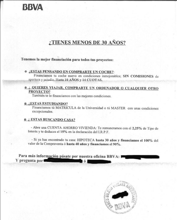 Pero si algo nos parece absolutamente patético, es el que desde el BBVA hayan dado esta orden literal a los directores de oficina: "una de las acciones a potenciar es la hipoteca anzuelo", esta filtración ha llegado desde el foro de Idealista. Tras este aviso, a los pocos días el BBVA ha remitido a todos sus clientes menores de 30 años lo siguiente: