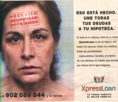 Nuestro caso ya es de especialista, si psicoanalizáramos este anuncio nos daríamos cuenta de que la expresión de esta señora es la máxima expresión de la cruda realidad del bolsillo español. Hasta ahora todos los anuncios de créditos y refinanciaciones tenían imágenes de felicidad, familias unidas, hijos sonriendo al papi que acaba de comprar una tele de plasma, un ama de casa sonriente al teléfono, etc. Pero la realidad es tozuda y esta empresa ha adoptado una nueva corriente más realista y con la que probablemente se identifique mejor el sufridor de la insoportable deuda que cada día arrastran más familias, y vamos a decirlo claro, ¡por su responsabilidad!, porque nadie nos obliga a embarcarnos en un buque que hace aguas por todos lados.