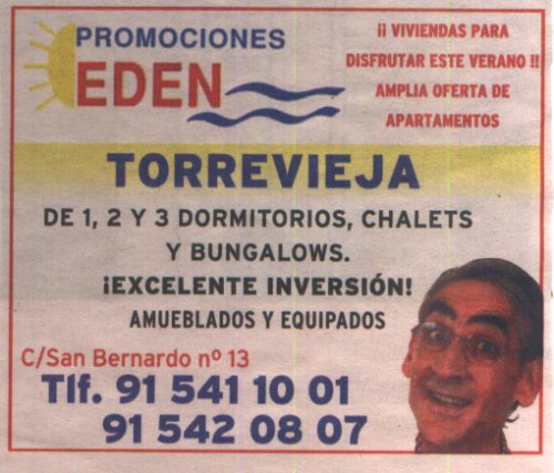 ¡Pues claro!, el amigo de Torrevieja y su excelente inversión, que lleva dándonos la vara en periódicos de toda clase desde ya hace por lo menos un año y medio, mirenlo, el es en realidad la perfecta representación de un palurdo del ladrillo, observen esa falsa sonrisa con una mueca de medio sorpresa/alegría, seguramente esas cejas replobladas y teñidas quieran expresar la autosatisfacción del "triunfador del pisito", que es en esencia el objetivo de este anuncio. Pero yo me paro a pensar... ¿De verdad alguien puede ser tan (con perdón) gilipollas de comprar un asqueroso pisucho de 1 dormitorio en tercera línea de playa por 98.000 ?, encima viendo la cara de bobalicón que tiene el "inversoh" del anuncio ya se te quitan definitivamente las ganas.